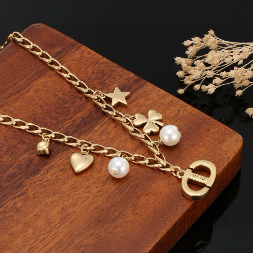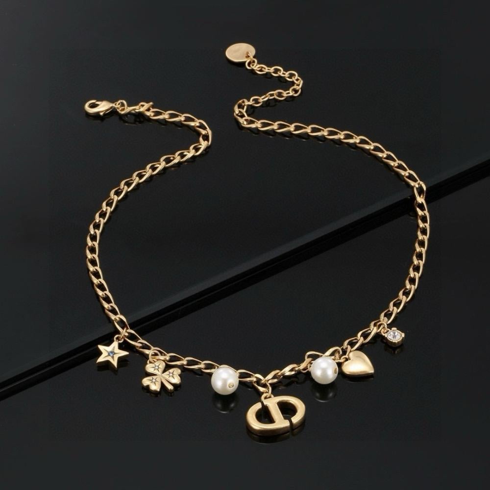 عقد فاخر من كريستيان ديور بسلسلة ذهبية أنيقة مزينة بتعليقات مميزة تشمل نجمة، ورقة برسيم، قلب، وحجر كريستالي لامع، بالإضافة إلى لؤلؤ أبيض يمنح التصميم لمسة راقية. يتميز بإغلاق بخطاف معدني لسهولة الارتداء وإمكانية تعديل الطول، مما يجعله مناسبًا لمختلف الإطلالات سواء اليومية أو الرسمية. تصميمه يجمع بين الفخامة والرقي ليضفي لمسة جاذبية على أي زي.