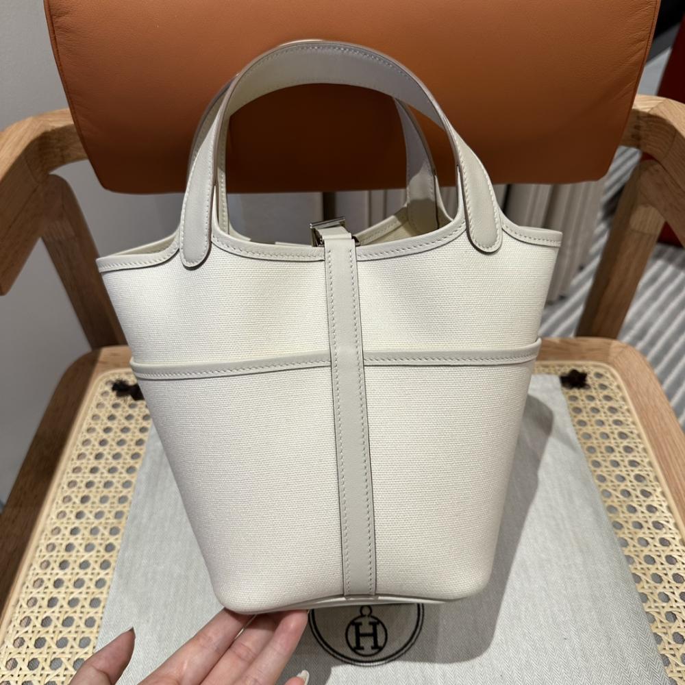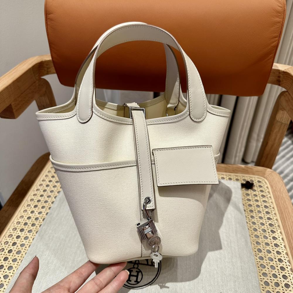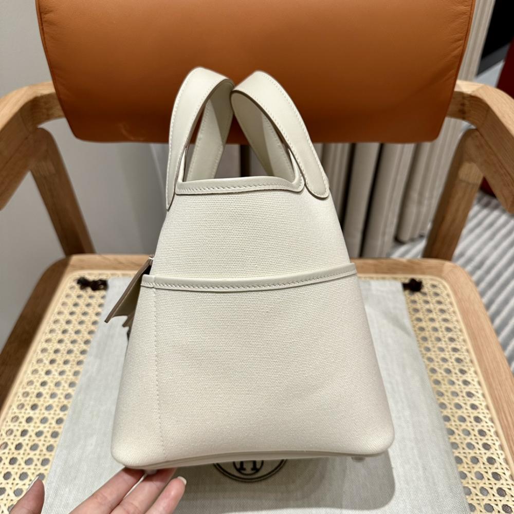 حقيبة هيرمس بيكوتين لوك المصنوعة من قماش الكانفاس الفاخر مع تفاصيل جلدية باللون الأبيض الكريمي الأنيق.